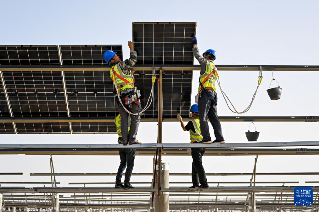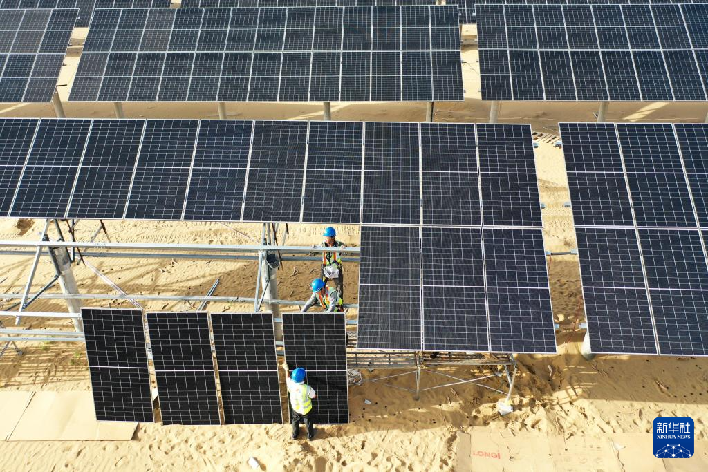 工人在库布其沙漠里的杭锦旗朔方新能源大基地安装光伏板(9月2日摄)。