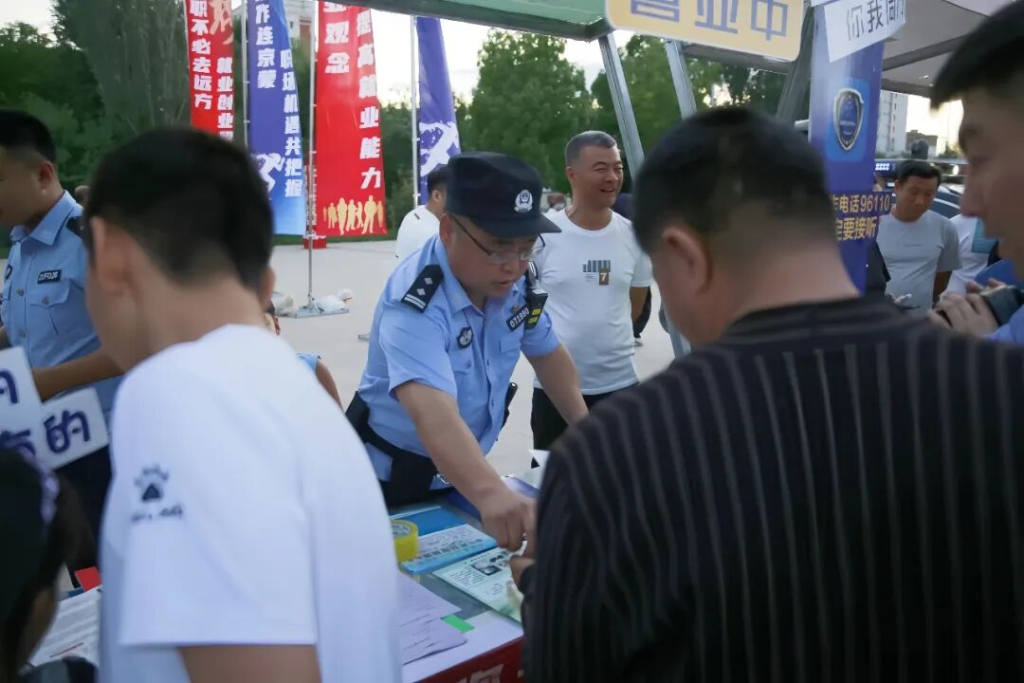 与暖心走访相呼应,8月28日傍晚的扎赉特旗同心广场开展了一场法治宣传活动。兴安盟公安局联合扎赉特旗公安局在广场上“摆摊设点”,将安全知识送到群众身边。“最近出现不少针对老年人的投资骗局,可得当心!遇到陌生人引诱投资,千万别轻信,一定要守好‘钱袋子’……”兴安盟公安局经侦支队政委孟文慧结合典型案例,耐心细致地提醒周边群众。