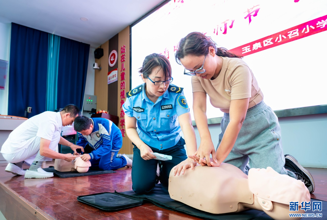 9月9日,医护人员在呼和浩特市玉泉区小召小学指导师生练习心肺复苏技能。新华网发(丁根厚 摄)