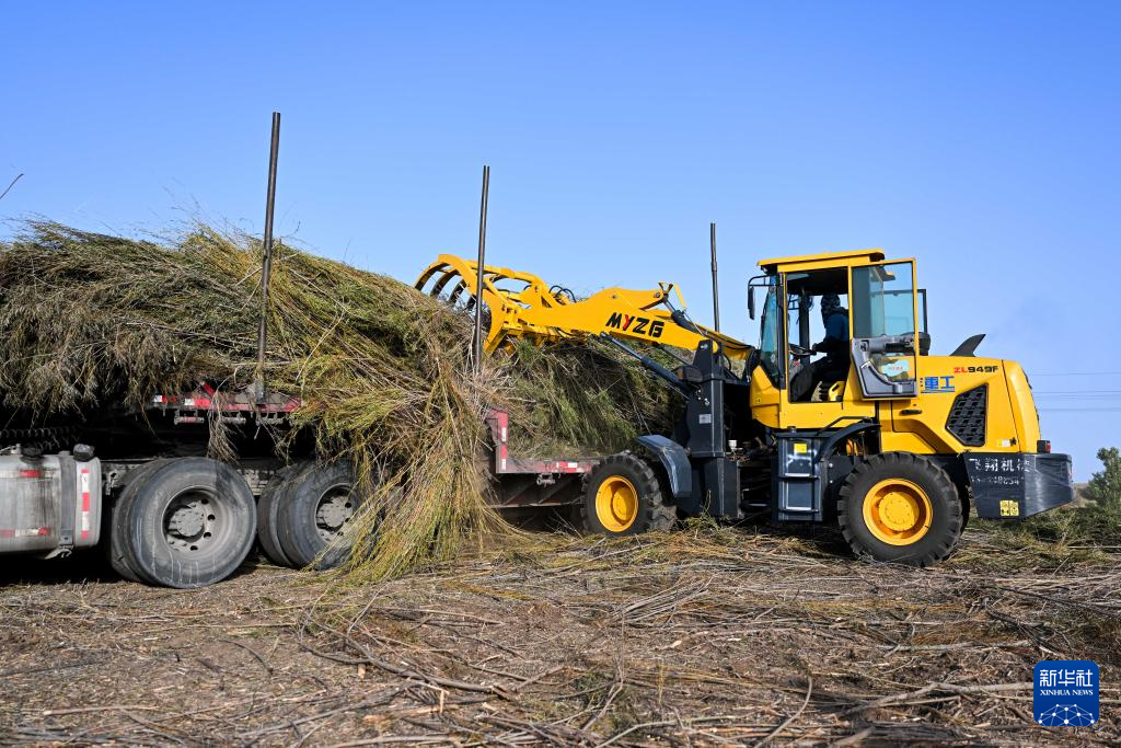 9月12日,工人驾驶机械在杭锦旗境内的库布其沙漠里卸载沙柳。