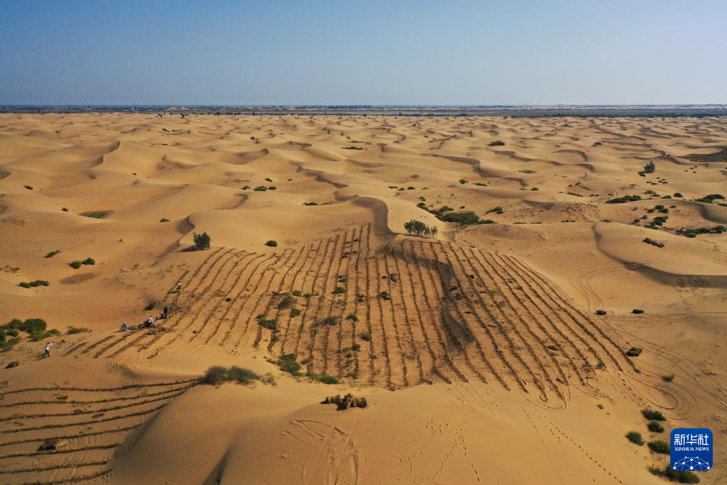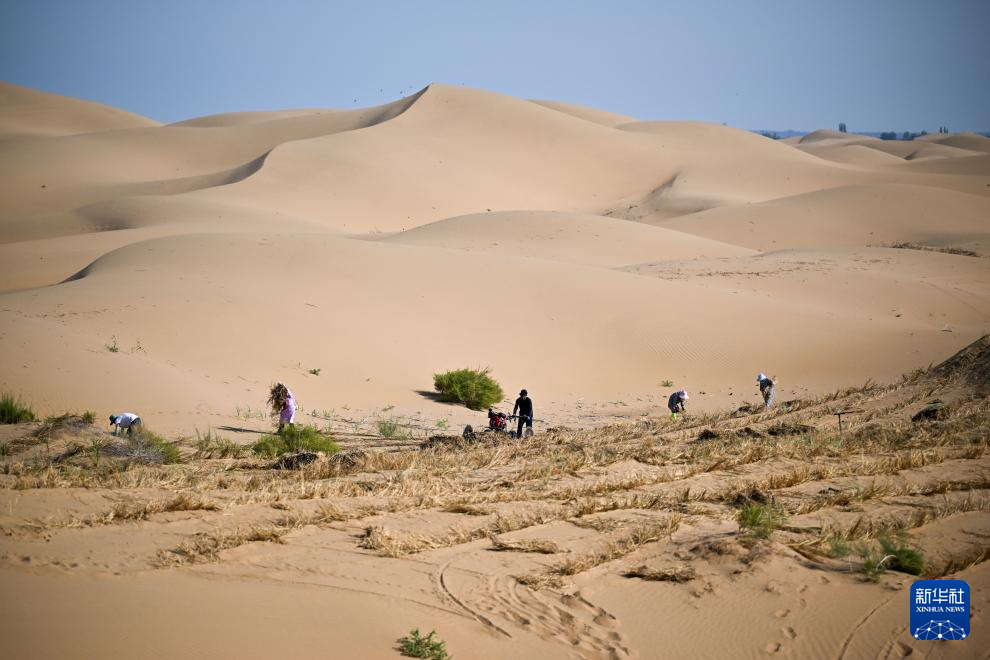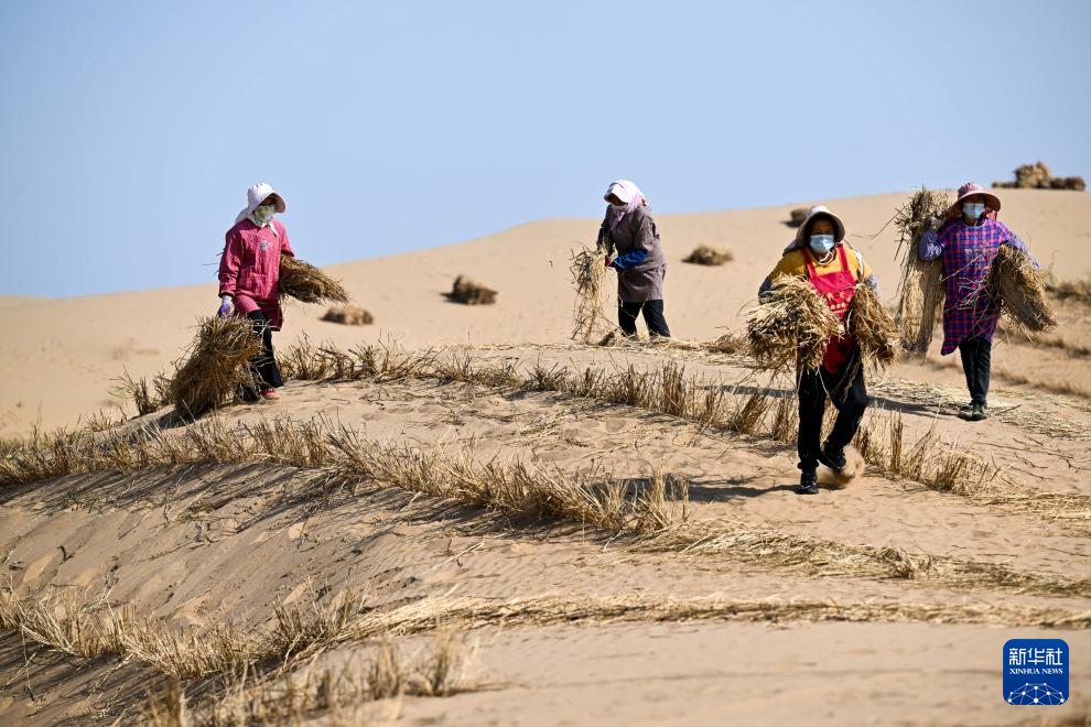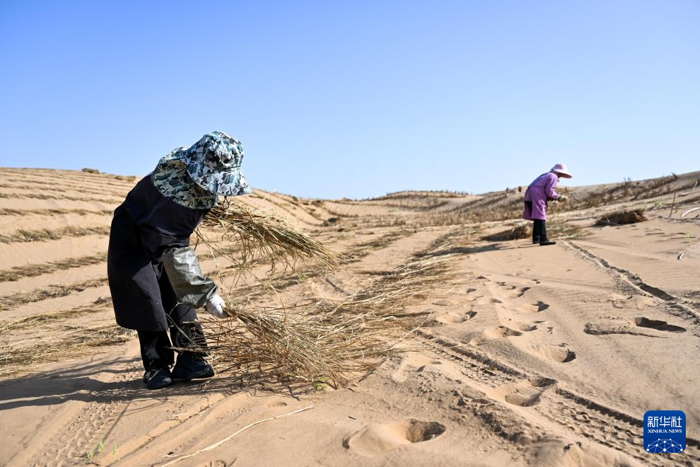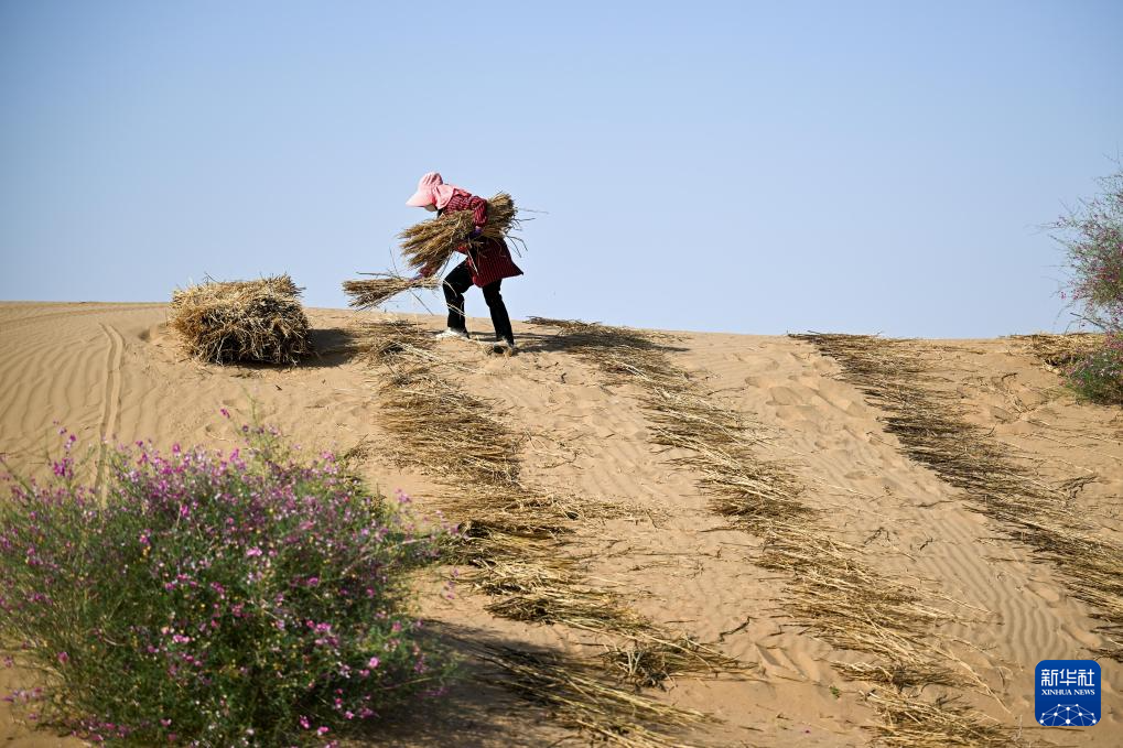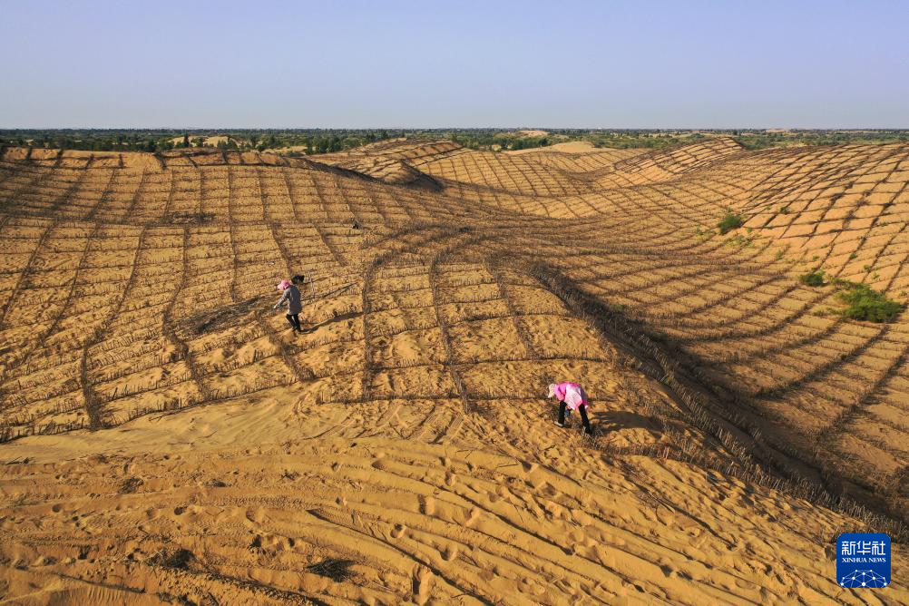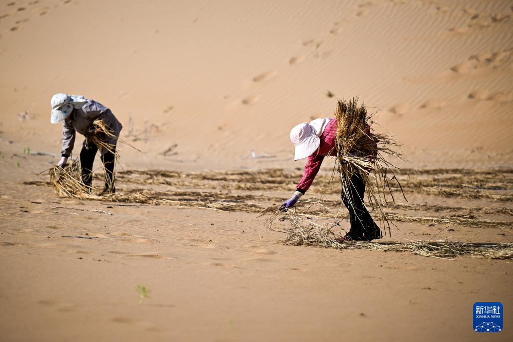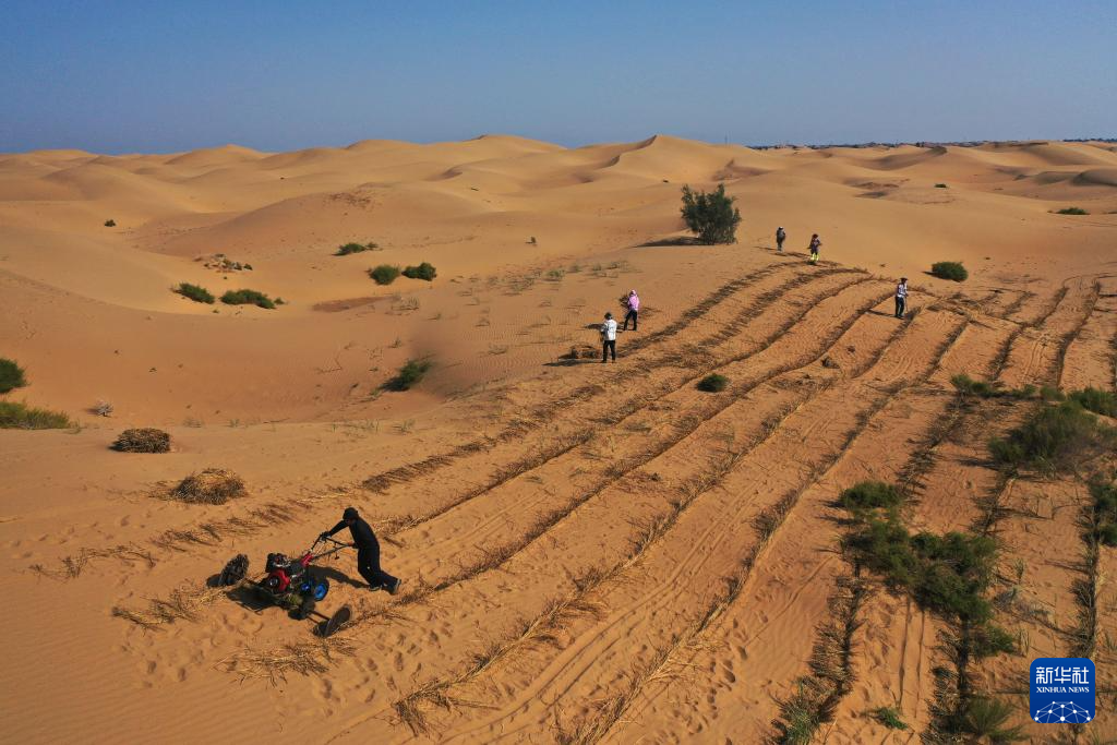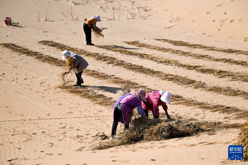 秋日,在内蒙古鄂尔多斯市杭锦旗境内的库布其沙漠,治沙工人忙碌地铺设沙障,进行库布其沙漠治理。近年来,杭锦旗有序推进荒漠化防治工作,实施建设库布其沙漠锁边林草带、风沙路径阻隔带、光伏治沙带等治沙项目,促进库布其沙漠生态环境改善。