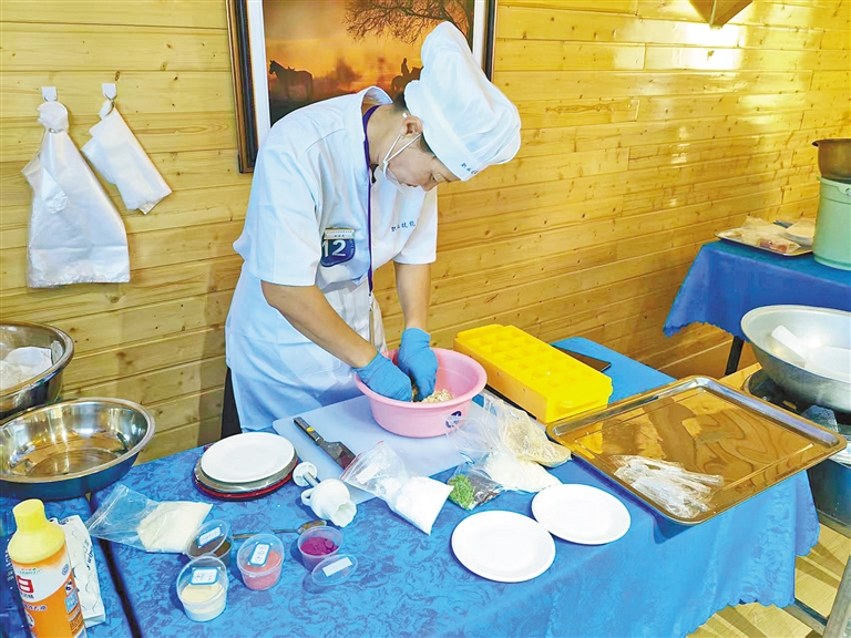 最吸睛的当数技能比赛现场。42名参赛选手有的专注地揉制奶团,确保质地均匀;有的在完成基础制作后,用模具压出图案。评委们不时走到选手身边,仔细观察操作步骤,认真记录打分。“这些选手的技艺都很扎实,不管是传统工艺的把控,还是创新想法的呈现,都让人眼前一亮。”评委点评道。