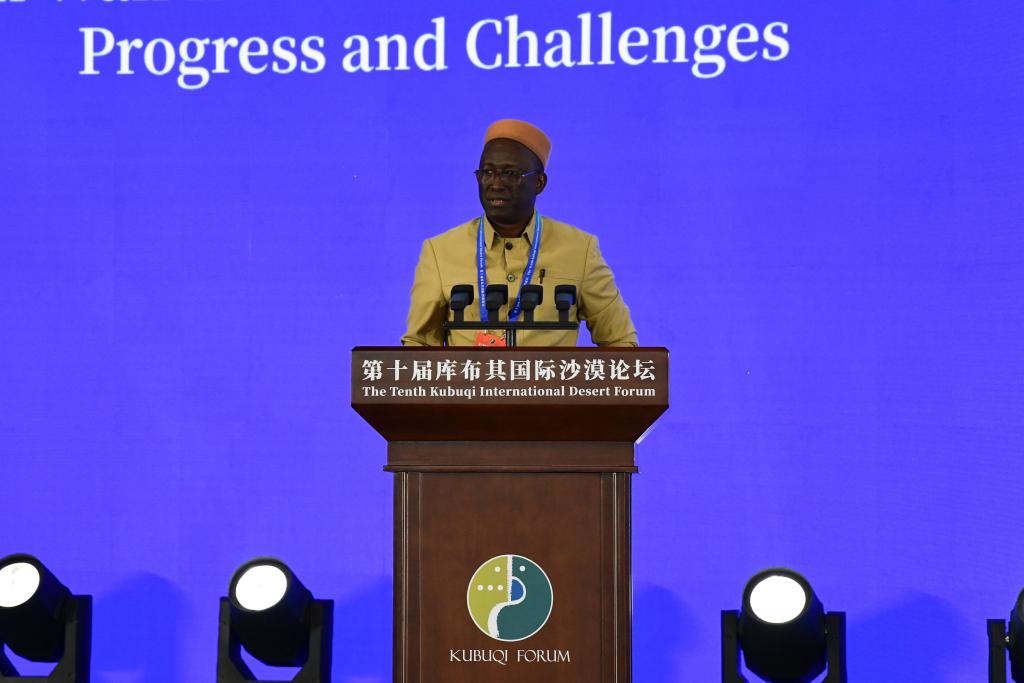 9月16日,泛非绿色长城组织研发办公室主任萨科迪亚·蒂亚姆做《撒哈拉和萨赫勒地区绿色长城倡议——进展与挑战》专题报告。(赵鑫磊 摄)