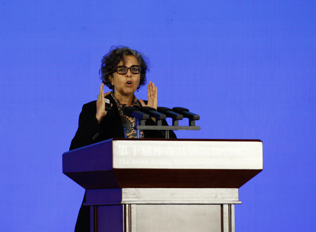 9月16日,联合国粮农组织土地与水资源司副司长诺拉·贝拉穆尼做《干旱区退化农地恢复》专题报告。(李爱武 摄)