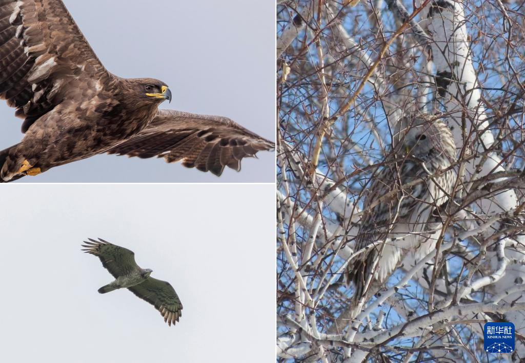 拼版照片:这是宝金财拍摄和记录的三个额尔古纳湿地自然保护区的鸟类新记录种(左上图为2025年9月5日拍摄的国家一级保护动物草原雕,左下图为2025年6月8日拍摄的国家二级保护动物凤头蜂鹰,右图为2025年3月5日拍摄的国家二级保护动物长尾林鸮)。新华社发