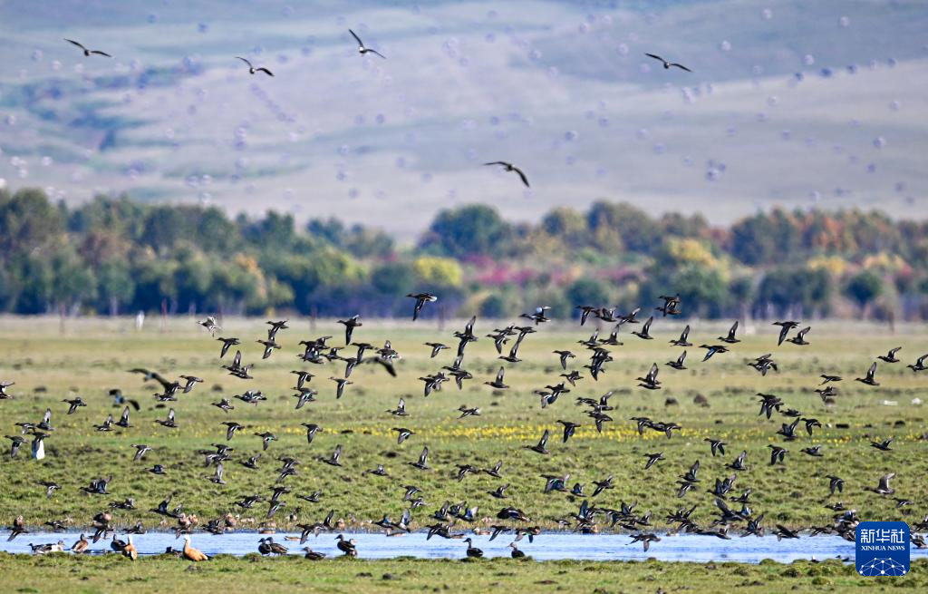 这是9月16日在额尔古纳湿地拍摄的灰鹤(无人机照片)。新华社记者 马金瑞 摄