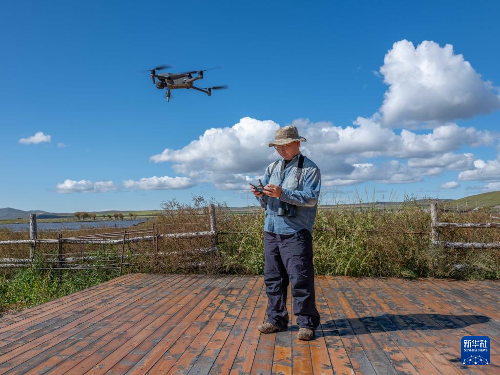 9月16日,宝金财使用无人机对额尔古纳湿地进行日常巡护。新华社记者 马金瑞 摄