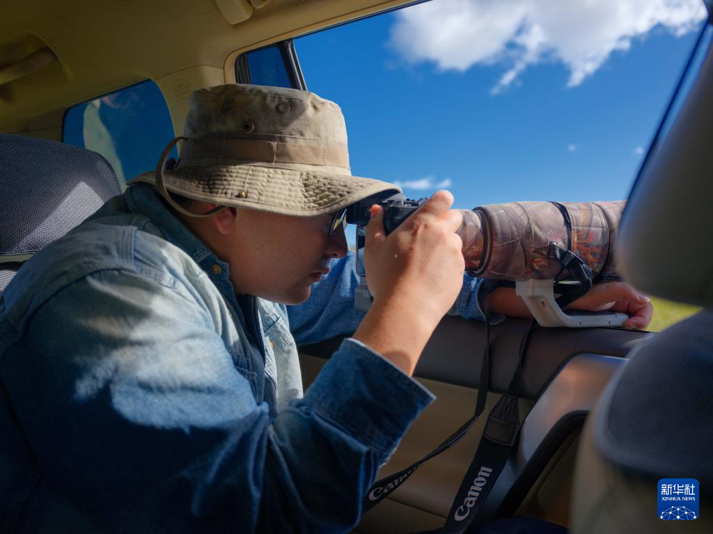 9月16日,在额尔古纳湿地,宝金财在车中使用长焦镜头拍摄鸟类。新华社记者 马金瑞 摄