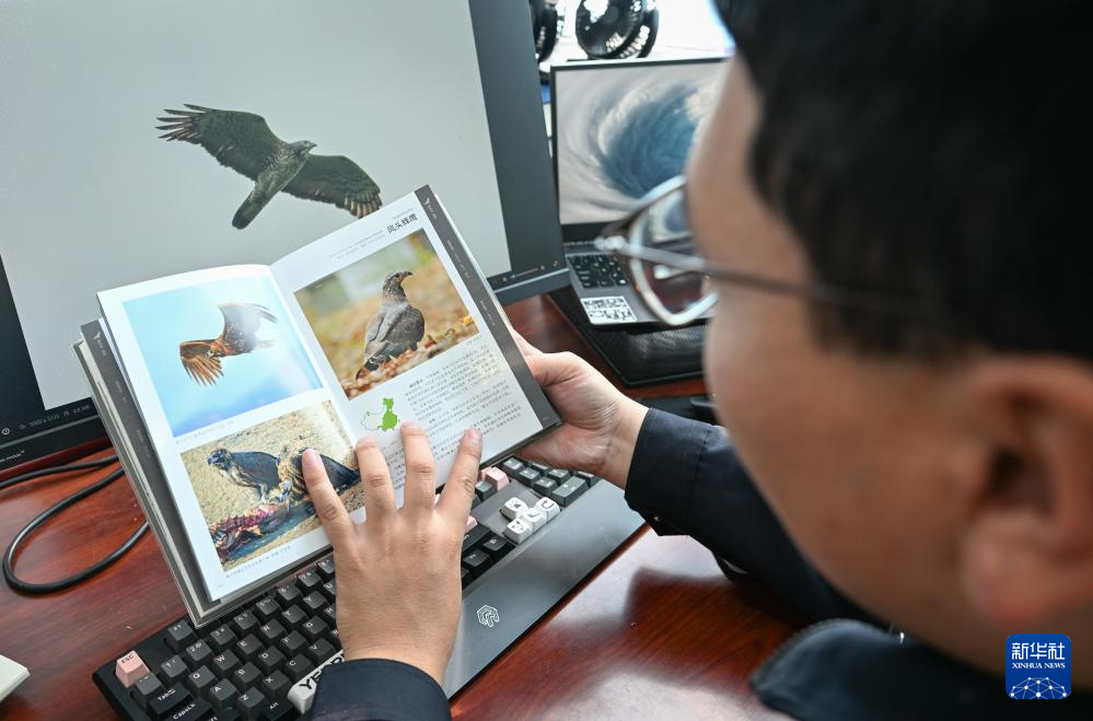 9月16日,宝金财在额尔古纳湿地自然保护区管理局核对拍摄到的凤头蜂鹰。新华社记者 贝赫 摄