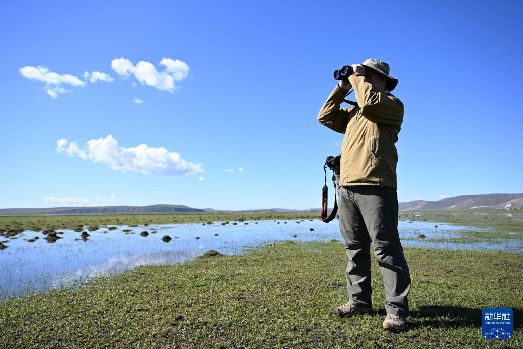 9月15日,宝金财在额尔古纳湿地自然保护区使用望远镜观测鸟类。新华社记者 贝赫 摄