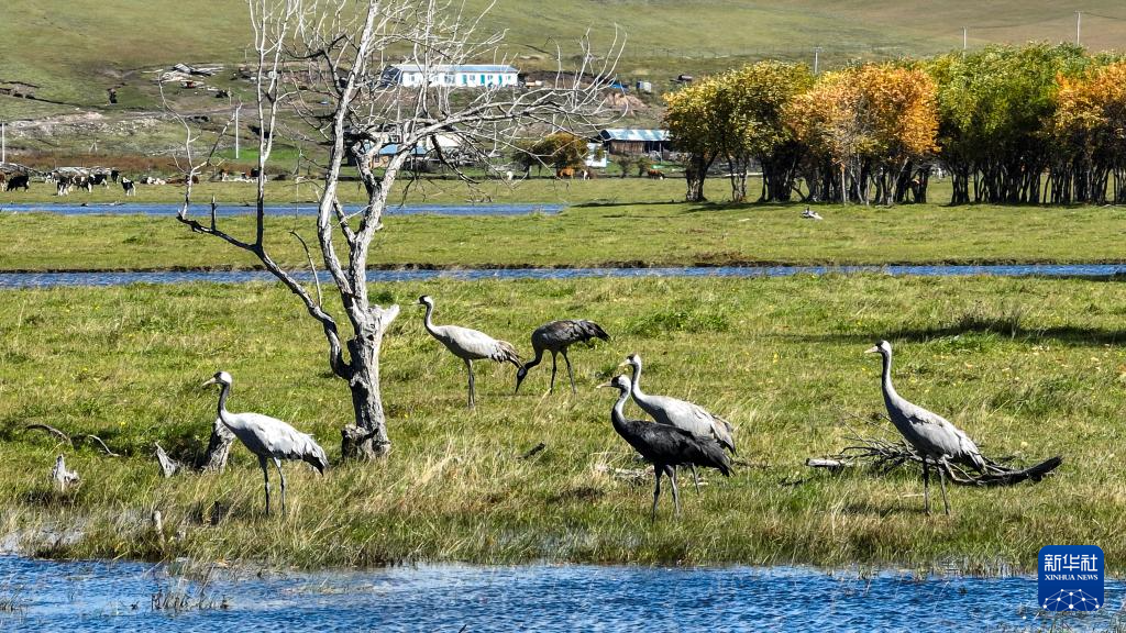 9月16日在额尔古纳湿地自然保护区拍摄的灰鹤。新华社记者 贝赫 摄