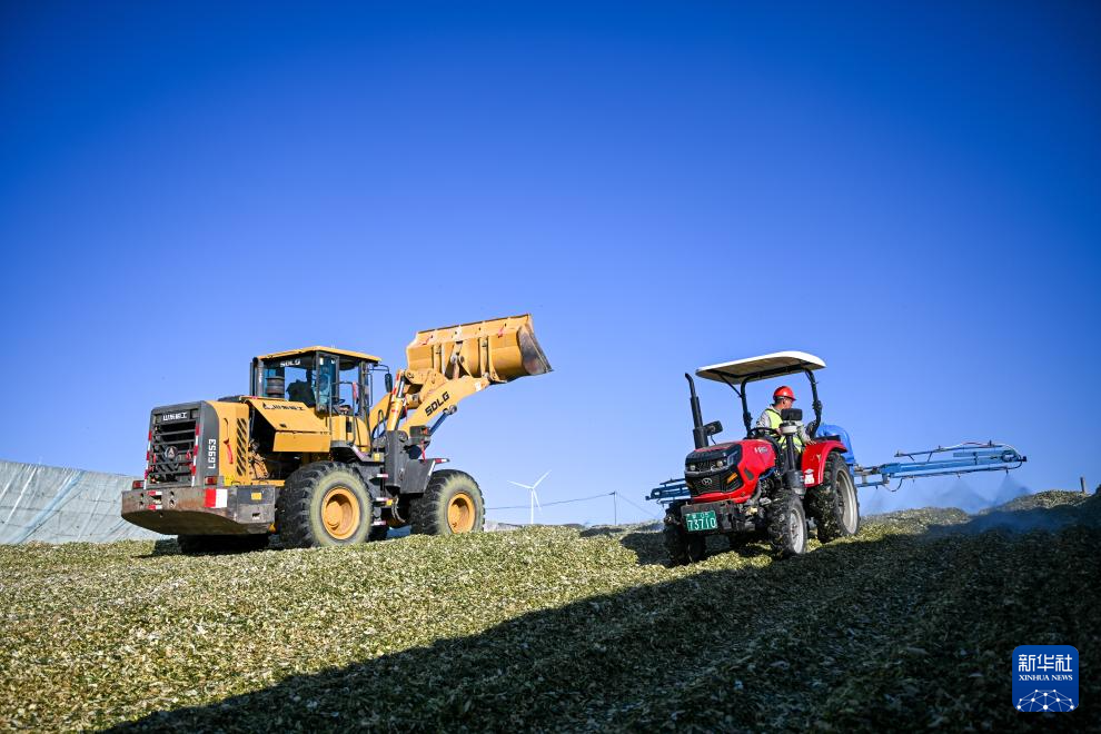 9月18日,在通辽市扎鲁特旗巨日合镇,工程车辆压实青贮玉米。新华社记者 连振 摄