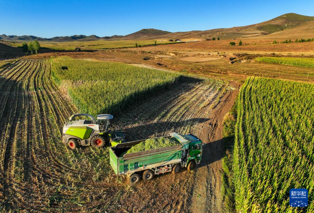 9月18日,在通辽市扎鲁特旗巨日合镇,农机在田间收割青贮玉米。新华社记者 连振 摄