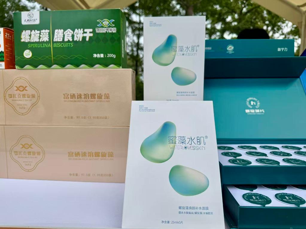 螺旋藻膳食饼干、富硒速溶螺旋藻、螺旋藻补水面膜……鄂托克旗螺旋藻展位上,除了传统藻粉、藻片等保健产品,还展出了螺旋藻面膜、代餐食品等一系列螺旋藻深加工产品,吸引众多参会人员驻足。