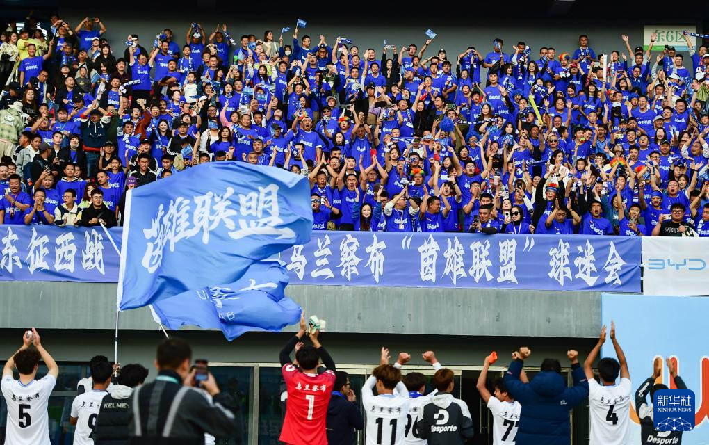 9月20日,乌兰察布队在赛后与球迷互动。 9月20日,2025年伊利内蒙古自治区足球超级联赛第五轮乌兰察布队坐镇主场对阵呼和浩特队,经过90分钟激烈比拼,在现场2万3千余名观众的助威呐喊声中,双方最终1:1战平。此役之前,乌兰察布队便以四连胜战绩提前两轮晋级八强,此战后又以4胜1平积13分的成绩提前一轮锁定小组头名。(康文魁 摄影报道)