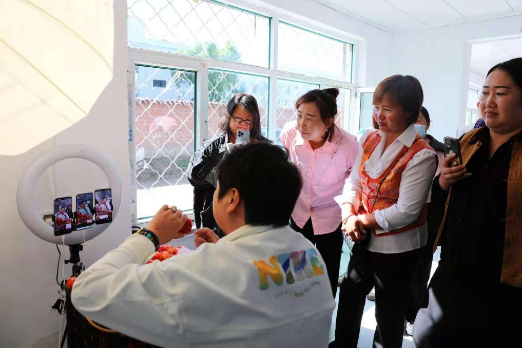 车间另一边,主播正对着镜头热情推介:“家人们,这是咱们科右前旗的特产沙果,酸甜无渣、一点不涩口……”学员们有的举起手机拍摄流程,有的围着工人询问包装技巧,还有的在认真记录直播话术,不放过任何关键细节。