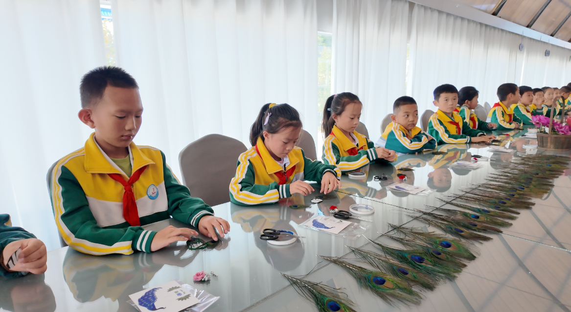 在乌兰浩特市义勒力特镇蒙雀养殖专业合作社,小朋友们展示孔雀羽毛手工艺品。