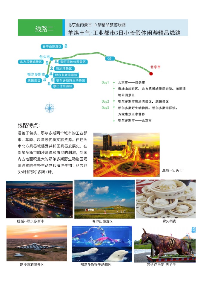 线路选择很灵活,适配不同需求:想寻都市烟火与历史味,选“探寻青城・品尝美食3日游”——在呼和浩特逛内蒙古博物院触达文明脉络,去塞上老街咬一口烧麦、尝块手把肉,让味蕾先“闯”草原;偏爱工业风,“羊煤土气・工业都市3日游”可探包头军工景区,看硬核工业基地的今昔变迁;想短途轻松玩,“北京向西一步・原味乌兰察布2日游”最省心,驱车即达草原与火山,适合家庭亲子游。