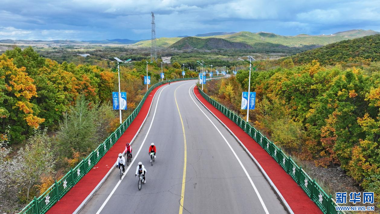 9月25日,内蒙古自治区扎兰屯市区通往卧牛河镇五星村公路,骑行爱好者在五彩斑斓的美景中骑行。新华网发(韩颖群 摄)