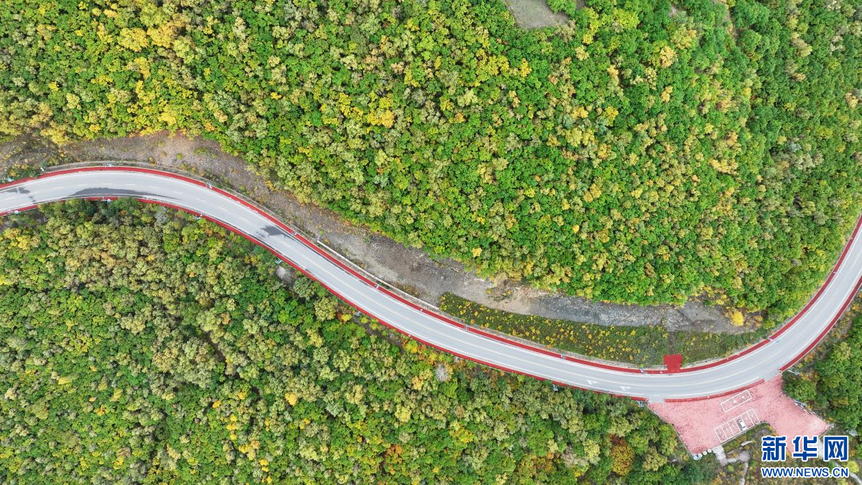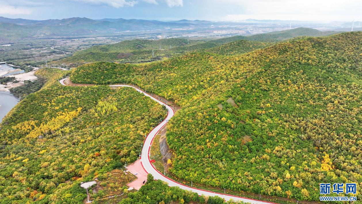 9月25日,内蒙古自治区扎兰屯市区通往卧牛河镇五星村公路与青山、绿树交相辉映,美景如画。新华网发(韩颖群 摄)