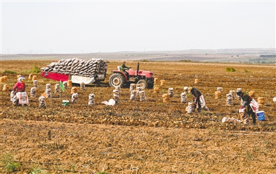 9月26日,在呼和浩特市武川县哈乐镇厂汉脑包村,工人正在采收马铃薯。今年,呼和浩特市武川县53万亩马铃薯喜获丰收,田野间处处洋溢着增收致富的喜悦。据农情调度,截至9月25日,内蒙古秋粮收获超1500万亩,较上年同期快0.5个百分点。本报记者 孟和朝鲁 摄