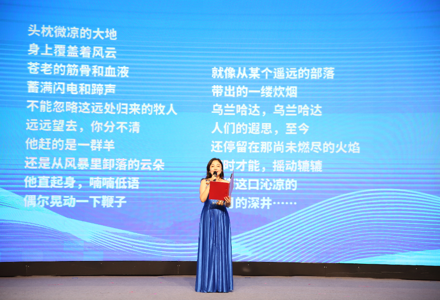 国家级普通话测试员、鄂尔多斯市朗诵协会会长萨娜朗诵《乌兰哈达》。新华网 杨腾格尔摄