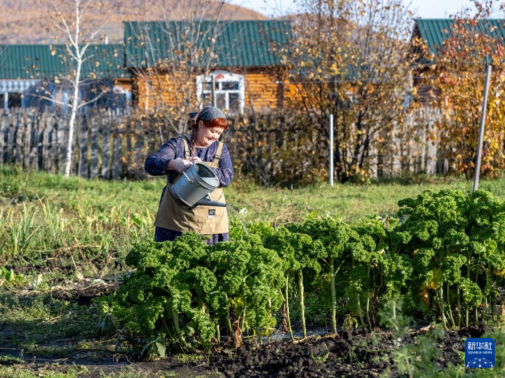 9月26日,在内蒙古呼伦贝尔市额尔古纳市恩和俄罗斯族民族乡,孙运梅给菜园浇水。