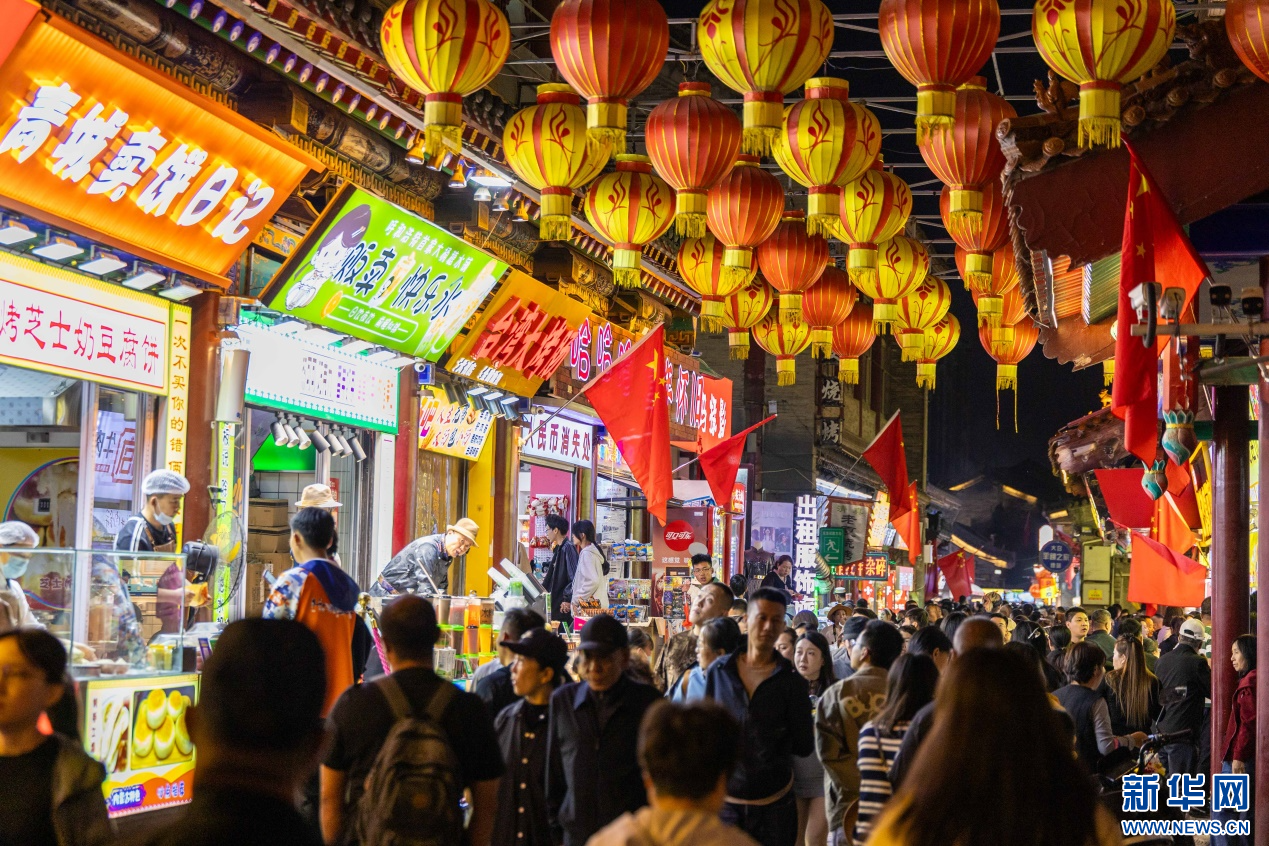 10月1日,呼和浩特市玉泉区塞上老街旅游休闲街区,游客在逛夜市、享受美食。新华网发(丁根厚 摄)