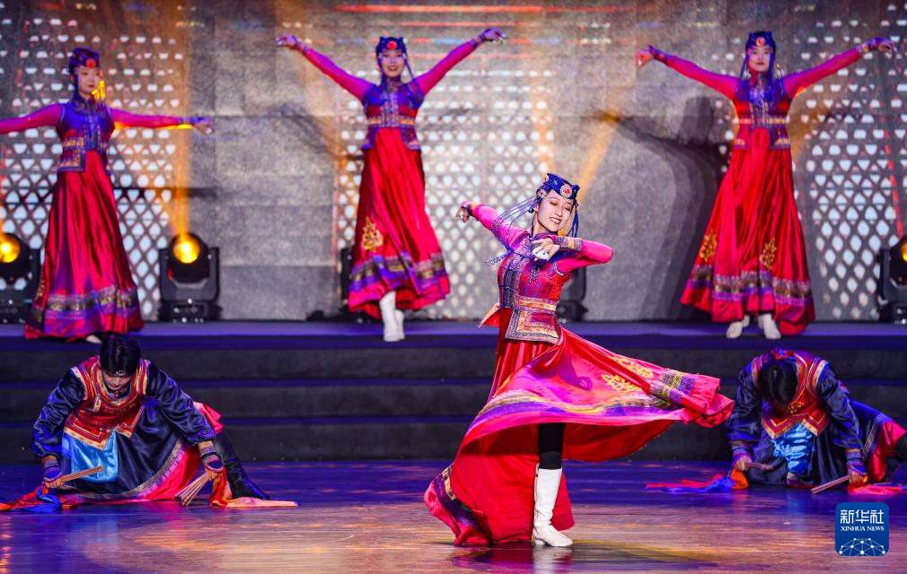 10月12日,东胜区乌兰牧骑演员在鄂尔多斯民歌回响音乐汇上表演音乐舞蹈《礼赞鄂尔多斯》。新华社发(康文魁摄)