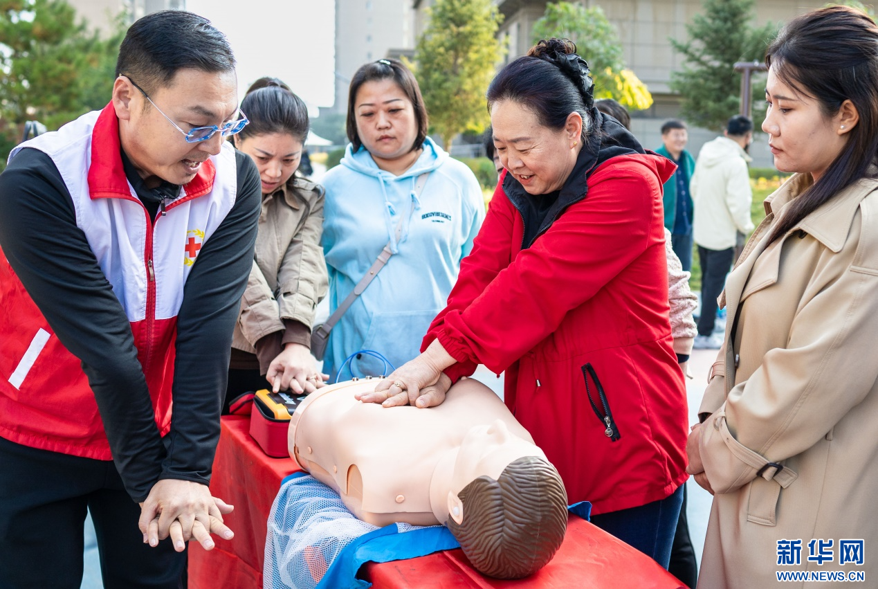 10月14日,呼和浩特市玉泉区“文明市集”主题活动现场,社区居民在红十字志愿者指导下学习应急救护技能。新华网发(丁根厚 摄)