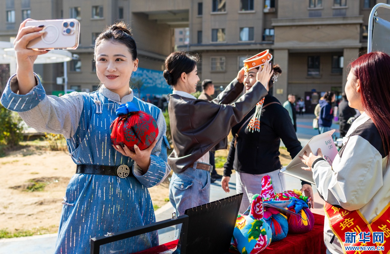 10月14日,呼和浩特市玉泉区“文明市集”主题活动现场,乌兰牧骑队员在了解“敕勒川巧娘”民族手工艺品。新华网发(丁根厚 摄)