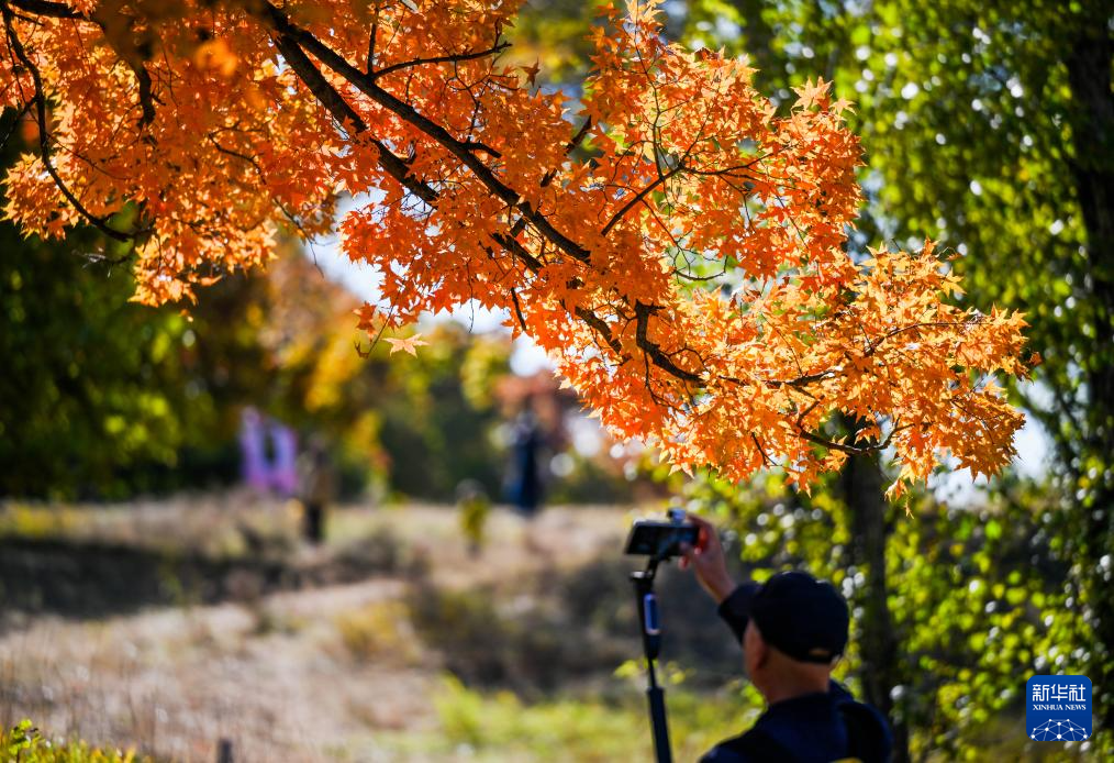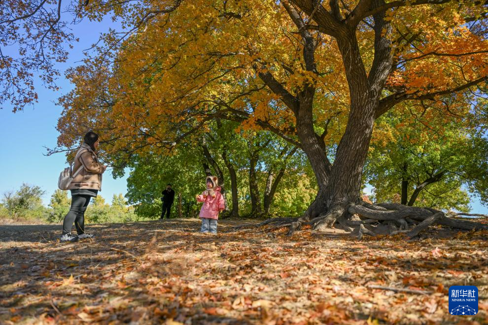 10月18日,游人在乌旦塔拉五角枫森林公园游览。
