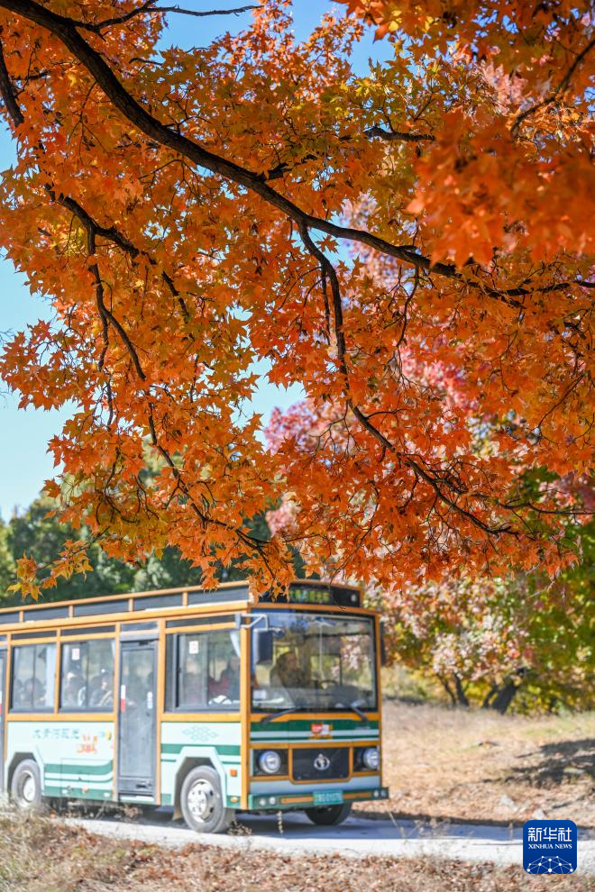 10月18日,游人乘车在乌旦塔拉五角枫森林公园内赏景。