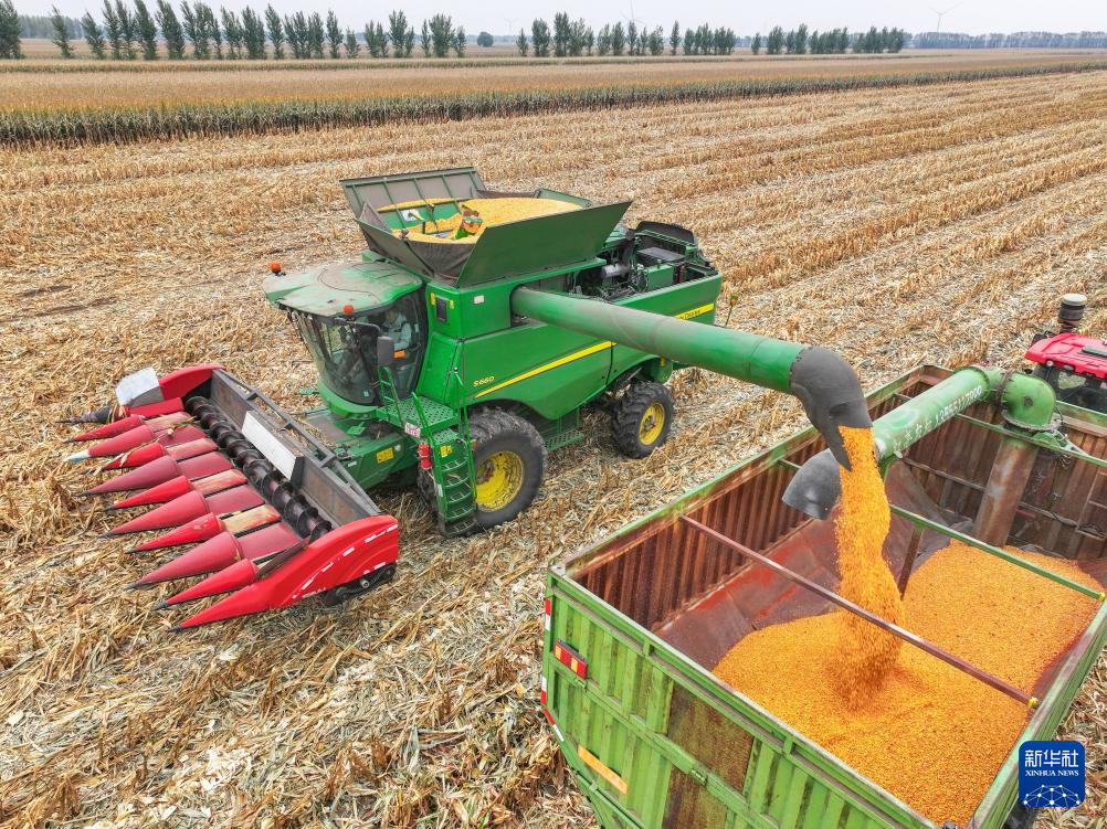 10月14日,在通辽市科尔沁区丰田镇,农机手驾驶收割机把玉米装入卡车。