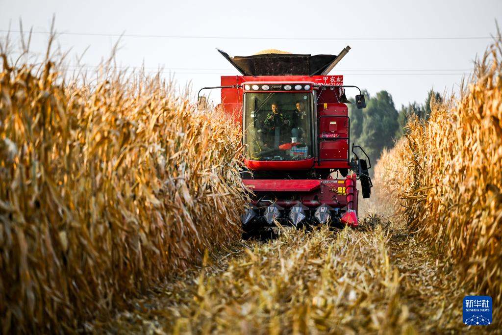 10月14日,在通辽市科尔沁区丰田镇,农机手驾驶收割机收割玉米。