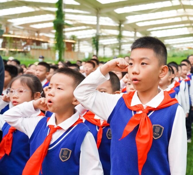 这是一次红色传承与研学实践的深度融合,新队员在生生不息的绿色中荣耀加冕,红领巾在绿意中迎风飘扬。