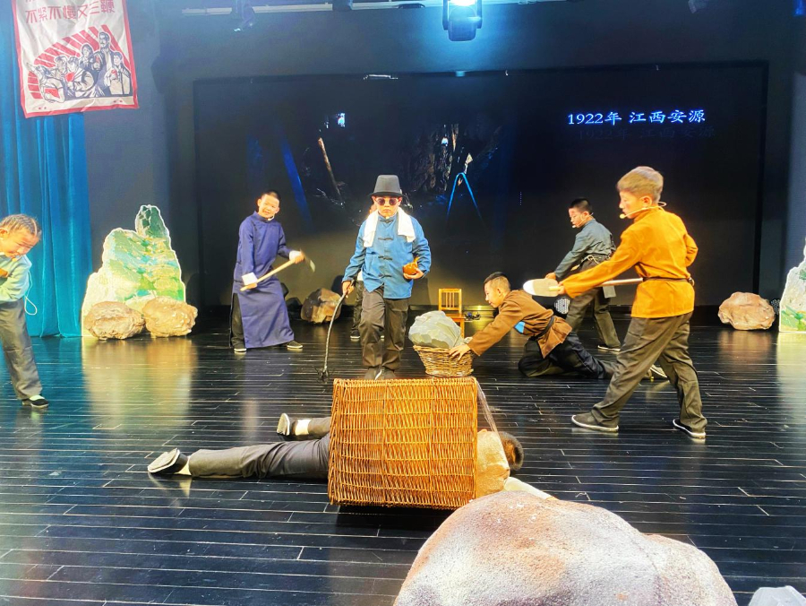 在主题升旗仪式上,三年级8班的老师和同学们共同演绎了音乐剧《一百岁的红领巾》。音乐剧再现了二十世纪二十年代,中国第一条红领巾在江西安源煤矿的童工中诞生的故事。