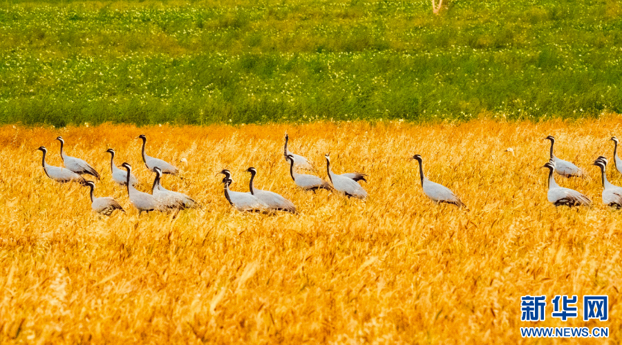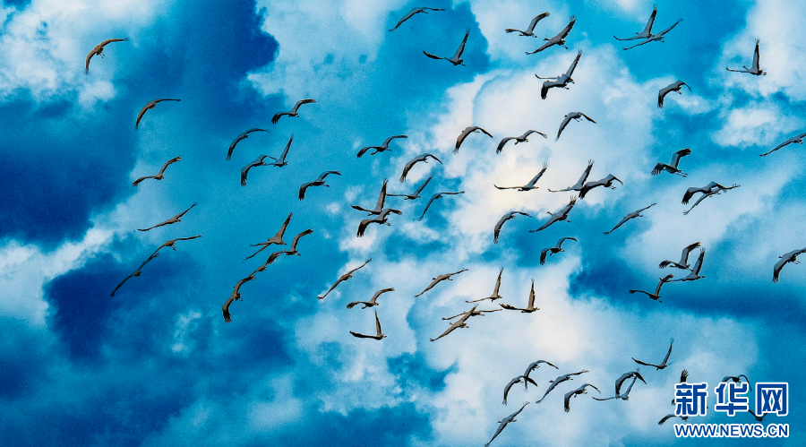 正在达里湖畔集结的蓑羽鹤,即将踏上南迁之旅。新华网发(蒙智超 摄)