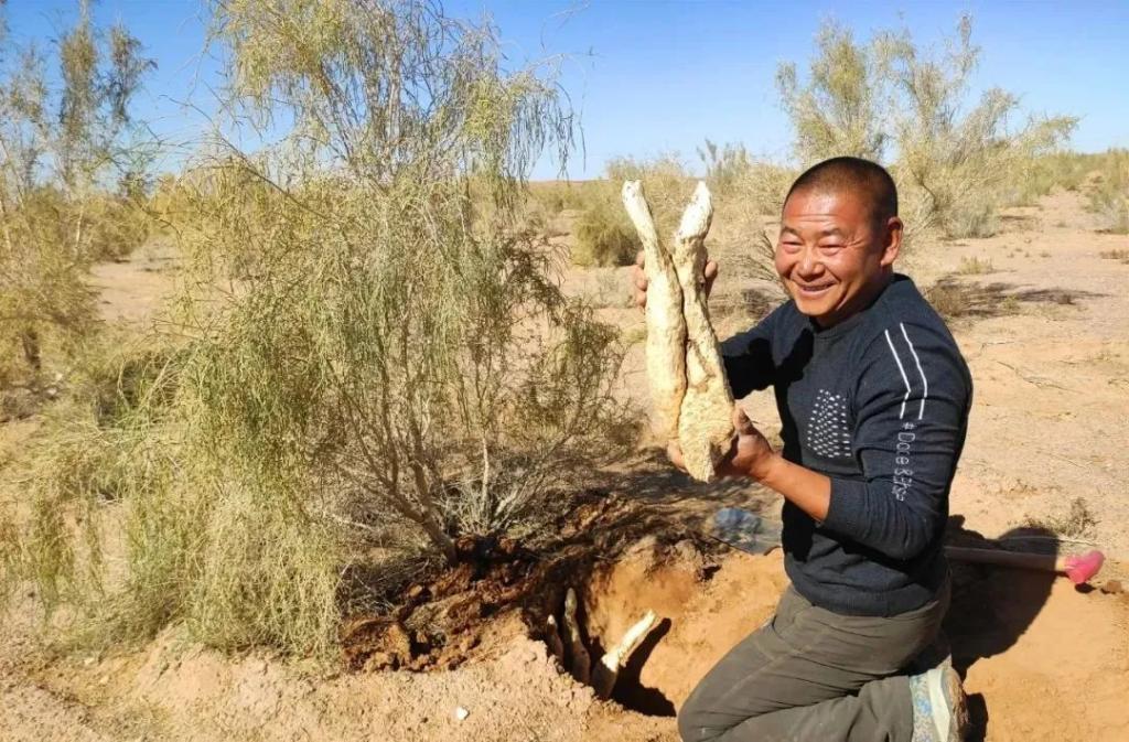 梭梭是具有防风固沙作用的乡土和先锋树种,其根部能接种肉苁蓉。潘多柱用小铲拨开梭梭根部的沙土,慢慢挖出一根饱满的肉苁蓉。“肉苁蓉被称作‘沙漠人参’,药用价值很高,现在鲜苁蓉一斤能卖十几块钱,晒干后价格卖得更高。”捧着沉甸甸的肉苁蓉,潘多柱感慨道,“以前守着沙漠受穷,现在不仅固了沙,还致了富。”