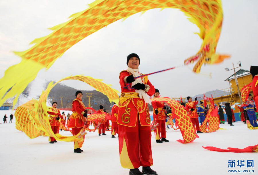 11月15日,在内蒙古自治区扎兰屯金龙山休闲度假旅游区,文艺工作者表演彩带龙。新华网发(韩颖群 摄)
