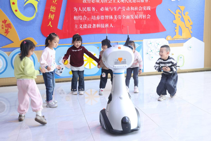 孩子们与机器人互动。