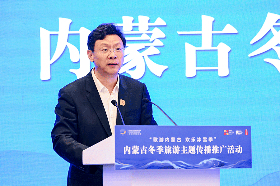 12月5日,储学军在2025企业家博鳌论坛“歌游内蒙古 欢乐冰雪季”内蒙古冬季旅游主题传播推广活动中致辞。新华网发