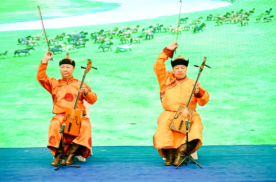 在2025企业家博鳌论坛“歌游内蒙古 欢乐冰雪季”内蒙古冬季旅游主题传播推广活动现场,乌兰牧骑队员进行马头琴演奏表演。新华网发