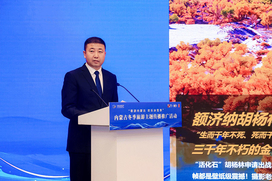 12月5日,阿拉善盟盟委宣传部副部长、盟文化旅游广电局局长高磊在2025中国企业家博鳌论坛“歌游内蒙古 欢乐冰雪季”内蒙古冬季旅游主题传播推广活动中作推介。新华网发