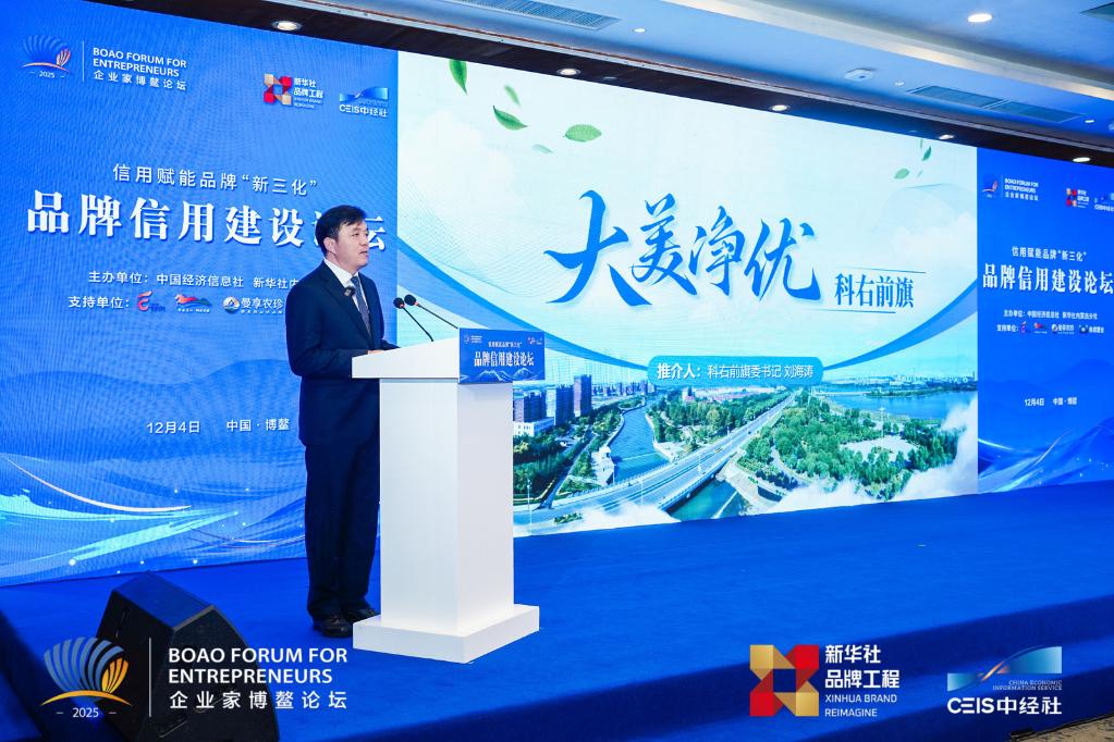 在2025企业家博鳌论坛品牌信用建设论坛上,科右前旗委书记刘海涛讲述当地生态保护与品牌建设实践。新华网发