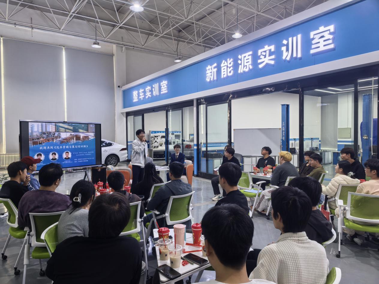 这节课的主题是汽车营销活动策划,教学现场设在学校机械与交通工程学院的汽车服务工程实验室。三名2023届、2024届、2025届毕业,目前任职于上汽奥迪、雷克萨斯、蔚来等汽车企业的校友重返校园,带着一线行业经验与职场故事,与学弟、学妹们展开了一场沉浸式对话。