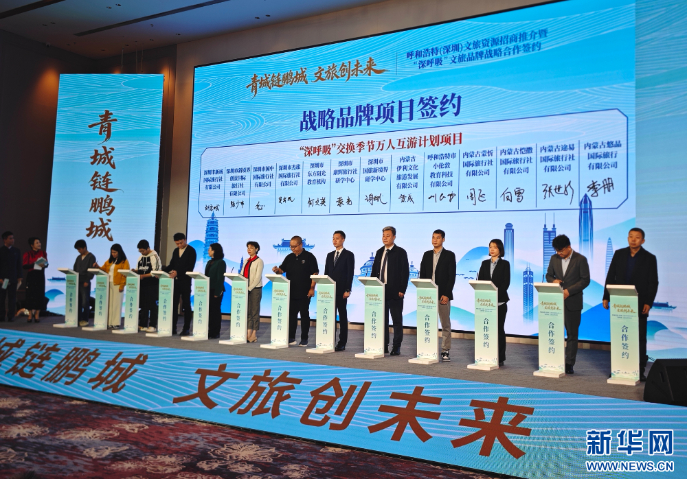 活动中,深圳市文化广电旅游体育局、呼和浩特市文化旅游广电局签订合作框架协议。深圳市旅游协会、呼和浩特市旅游协会签订市场合作协议。两地文化演出机构签订舞剧《昭君》《敕勒川》巡演合作协议,两地8家单位签订“文旅+航空”冰雪融合线上产品合作项目,13家文旅企业签订“深呼吸”交换季节万人互游计划合作项目,共同推动“南客北游、北客南行”规模化、常态化互访交流。签订“老牛湾大峡谷旅游区”规划运营框架合作项目、土左旗景区提质战略框架合作项目、“马鬃飞雪”呼和浩特冰雪研学专列合作项目,启动“呼和浩特—深圳”文旅联盟。“引客入呼”联络办公室揭牌,为两地旅游协会互为副会长单位授牌。