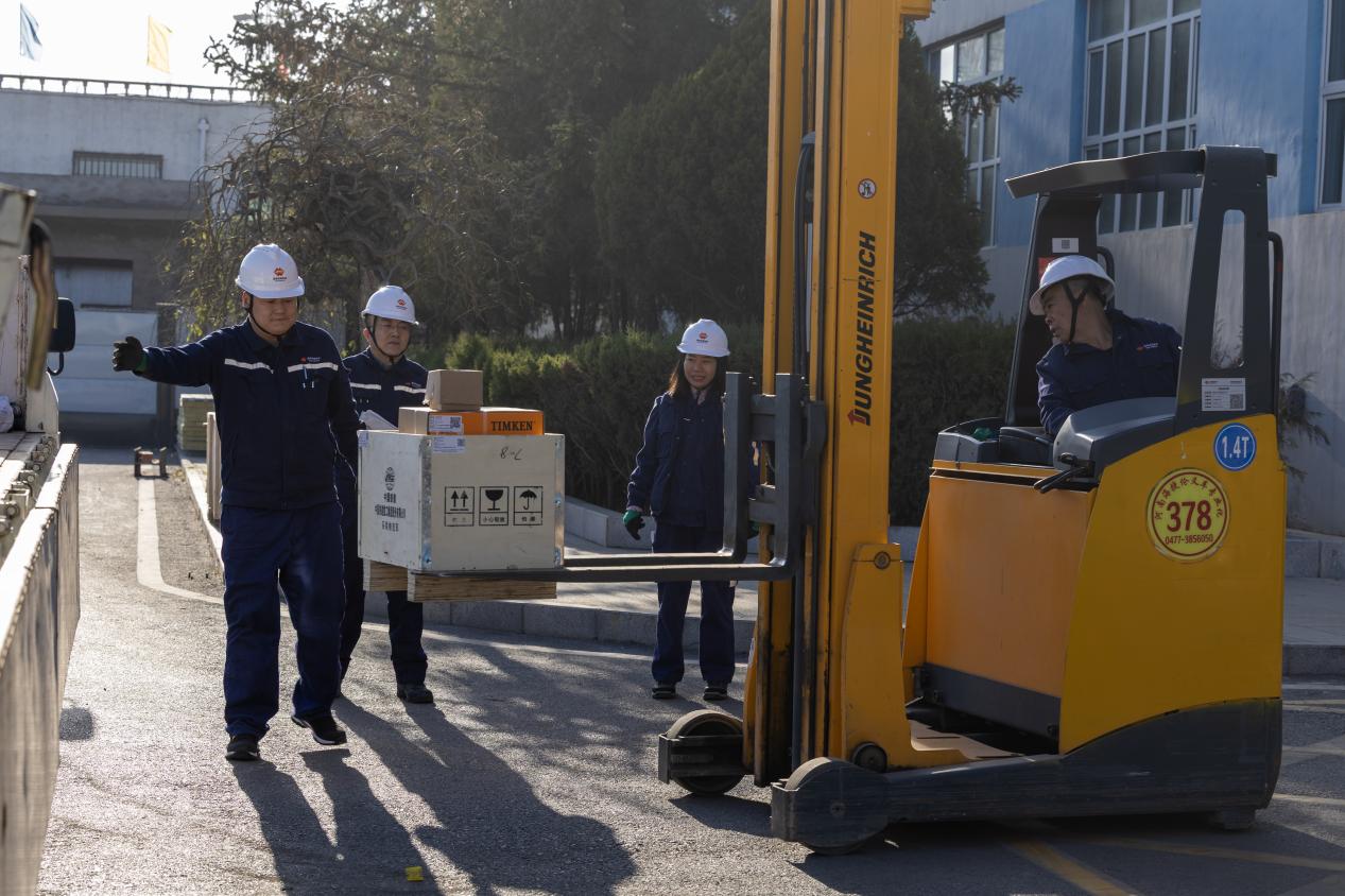图为物资供应中心大柳塔物资库工作人员正在配送运转皮带保护配件。该库推行双维度立体化安全管理模式,构建纵横交织的防护体系,确保责任层层压实。(刘长江 摄)