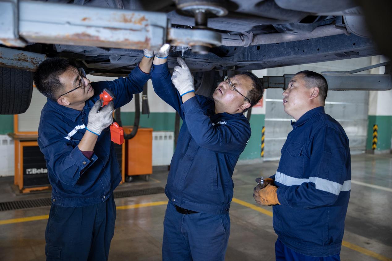 图为车辆管理中心三名检修工正对车辆后差速器进行检查。该中心持续强化自营车辆的运行调度、维修管理,全力保障各矿井车辆运输的安全稳定。(刘长江 摄)