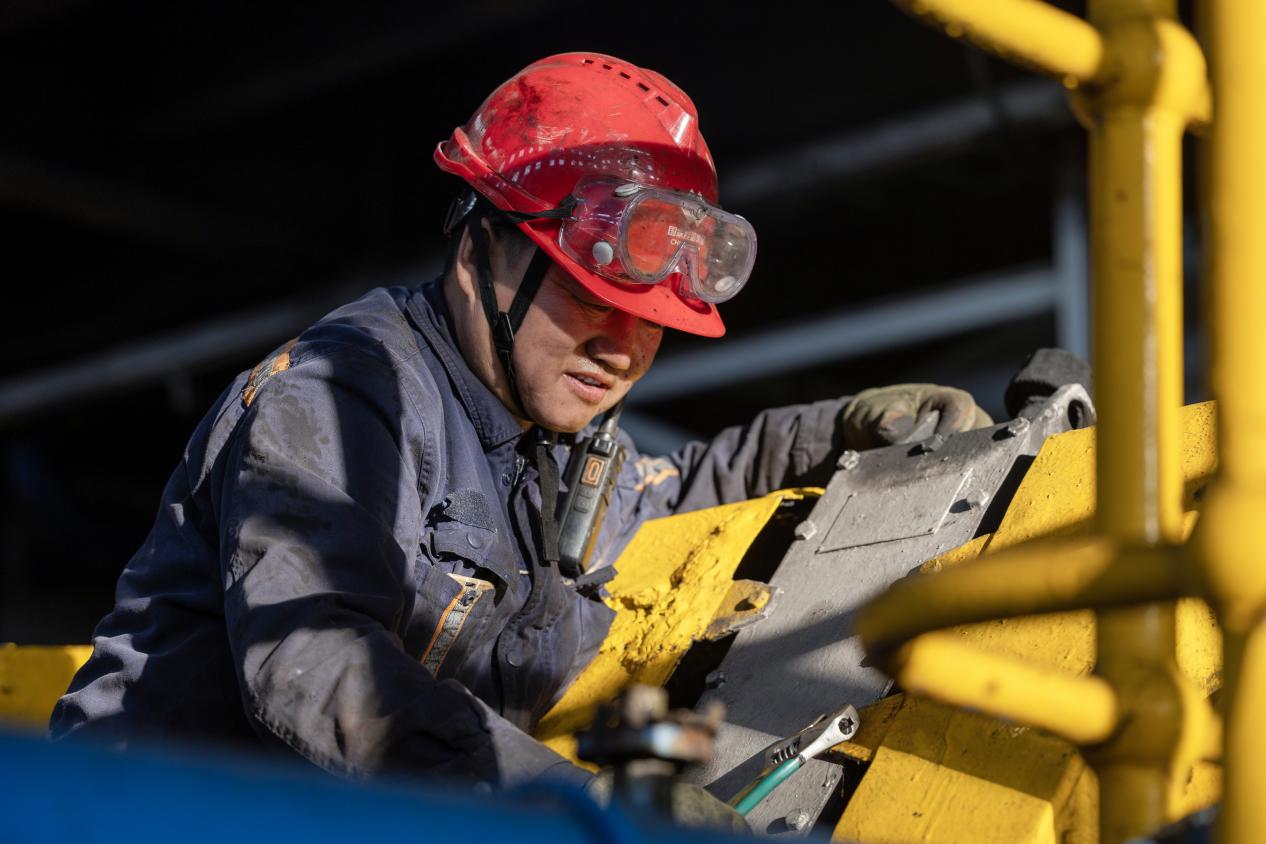 图为洗选中心大柳塔选煤厂员工正进行激振器护罩螺丝紧固等日常维保。该中心通过优化流程、强化维保、落实防冻措施,全面保障设备稳定运行与煤炭高效外运。(刘长江 摄)